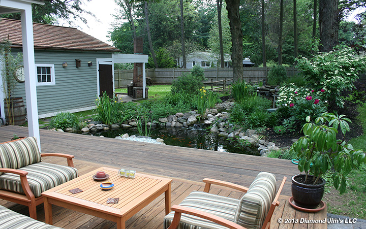 Another view of the deck shown 7 months later. Here you can see the color difference caused by different batches of wood installed at different times. Where the chairs are is the area that was stripped.